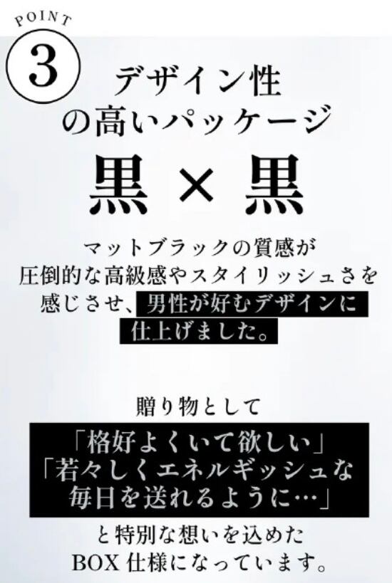贈り物として「格好よくいて欲しい」「若々しくエネルギッシュな毎日を送れるように…」特別な想いを込めたBOX仕様になっています。